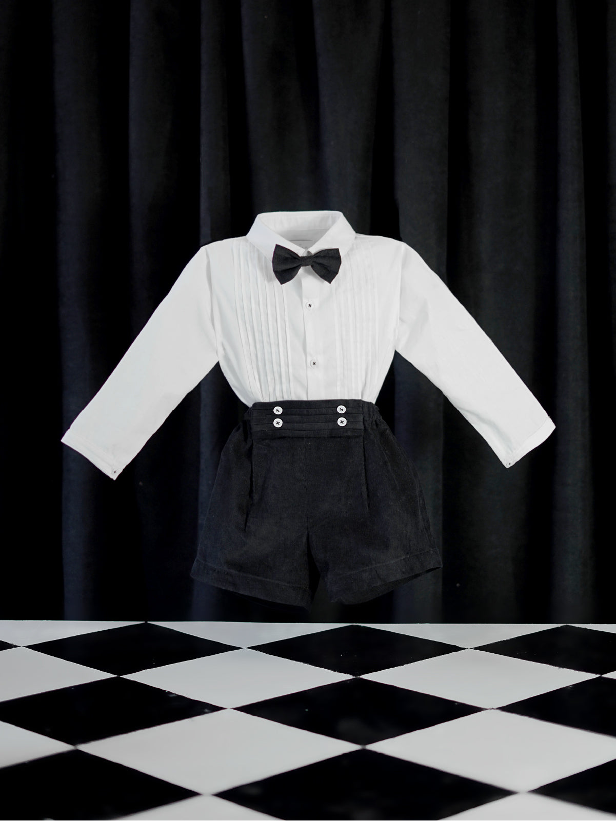 Our iconic Ansel set is making a comeback this season. This corduroy set is sharp and exceptional for your little boys formal look. This occasional wear is perfect for weddings, birthdays, or holiday dinners. The set features hand pleated details on the shirt, with adjustable waistband shorts, and detachable matching bow tie.