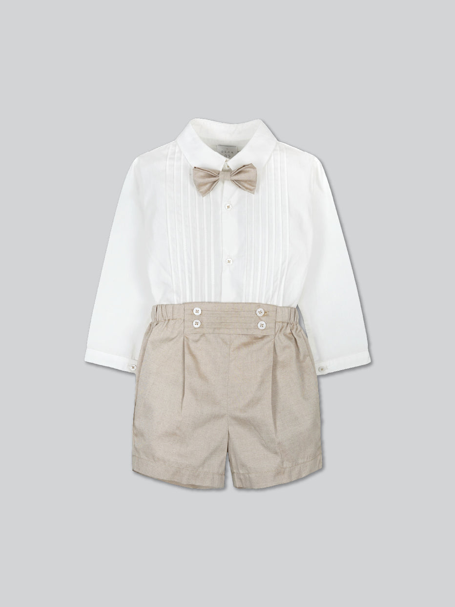 Our Ansel set is making a comeback, this time in a timeless color combination, white and khaki. This occasional wear is perfect for weddings, birthdays, or formal dinners. The set has hand pleated details on the shirt, with adjustable waistband shorts, and detachable stunning bow tie.