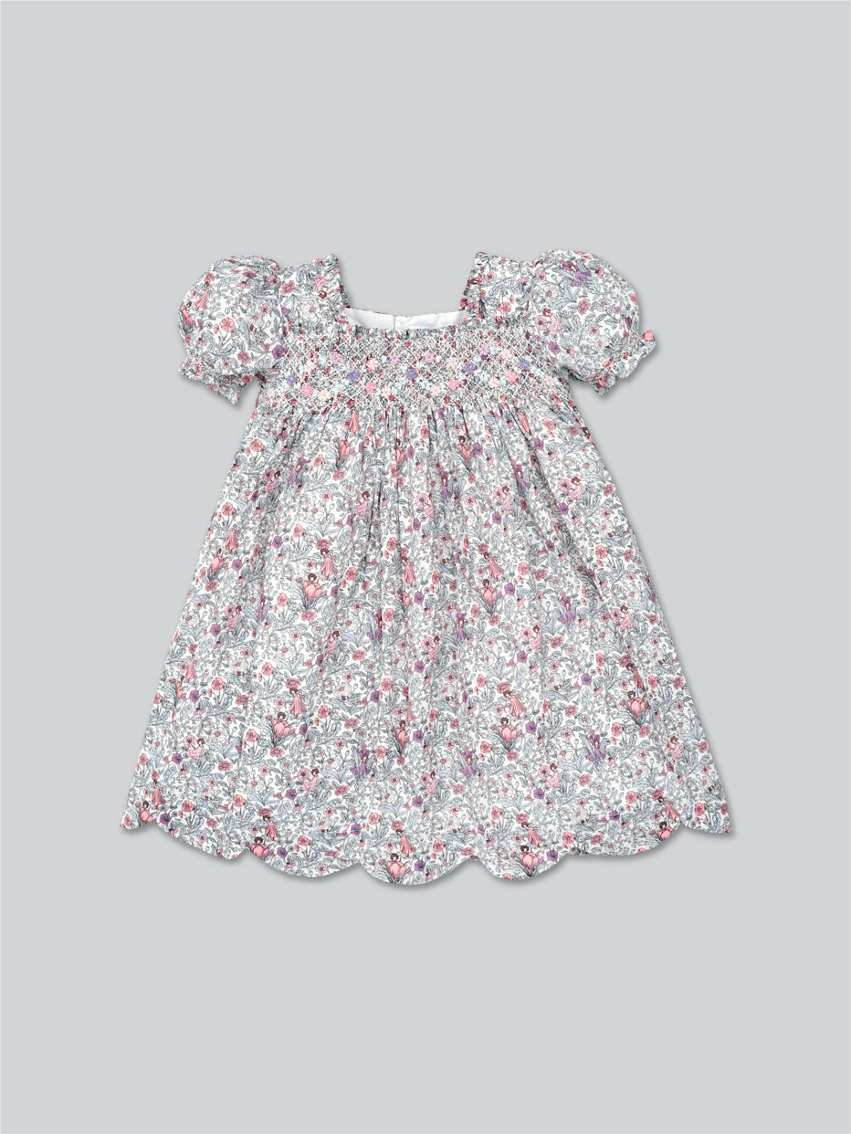 Introducing the Avery Dress. Designed with our signature periwinkle print fabric inspired by storybook woodlands and fairies, this spellbinding piece also features intricate pink and periwinkle flower hands mocking across the chest. Its square neck, delicate puffy sleeves, and scalloped hem, make this dress perfect for playtime and wonder.