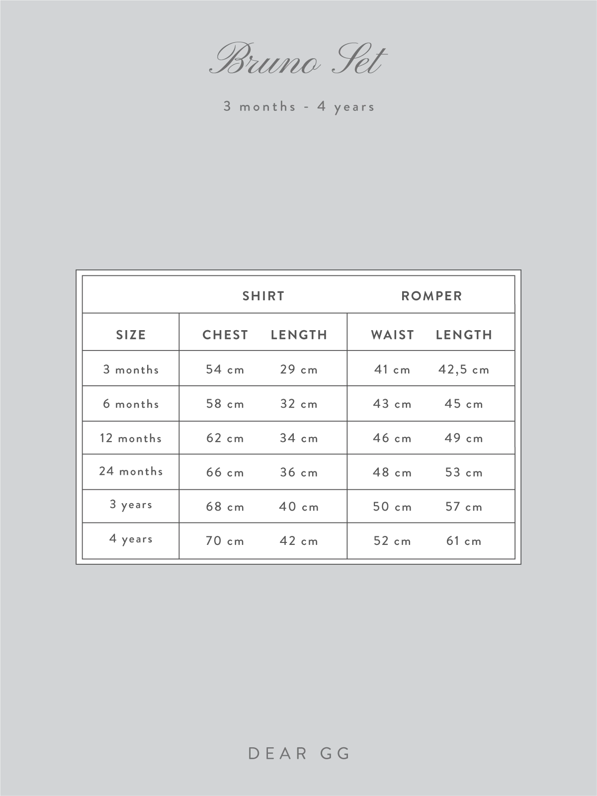 Meet our Bruno Set with vintage Squirrel embroidery with matching "le petit écureuil" embroidery on its collar. This two-pieces set consists of sharp white shirt with button fastening in the back, while the dungarees has exposed button fastenings to the front.