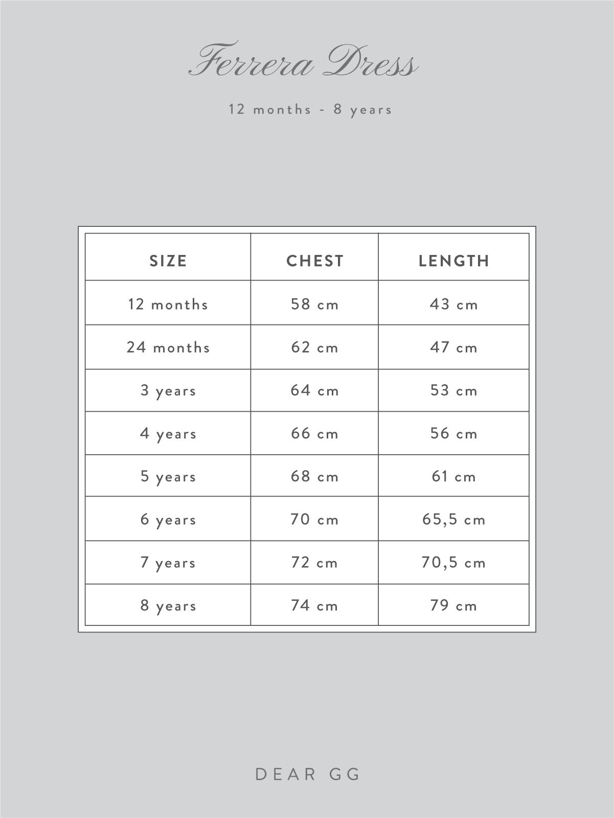 Our Ferrera dress in iconic silhouette from Dear GG. Featuring scalloped peter pan collar, with hand smocking details across the chest and collars. A stunning piece that brings a graceful and timeless charm to your child's collection.