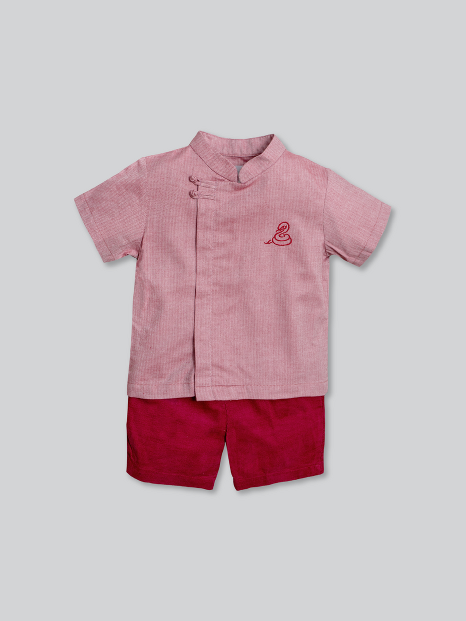 The Jasper Set is our modern on the classic Mandarin Cheongsam. The set comes with light red short sleeves shirt adorned knot buttons and mandarin collar. While the deep red shorts feature adjustable waistband and a pocket on each sides for that stunning ensemble. Choose between initials or Chinese zodiacs embroidery for a personal touch to the outfit.