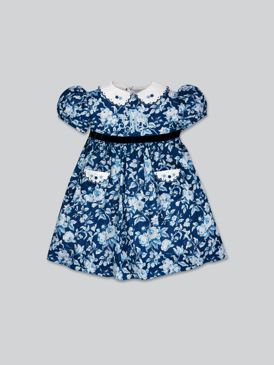 Stunning midnight blue floral dress for girls, fully lined with cotton and made in lightweight cotton fabric. Ideal for any occasion, the dress features personalized initials embroideries across the chest, with delicate scalloped collar and floral embroideries details. The sweet velvet sash adds an elegance to this gorgeous dress.