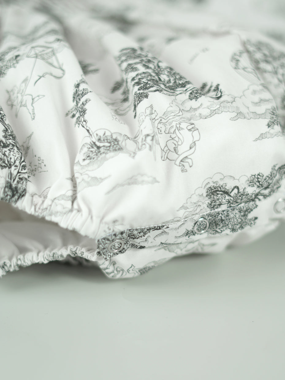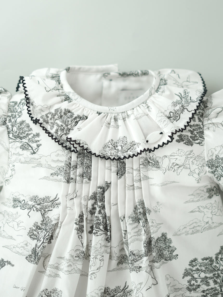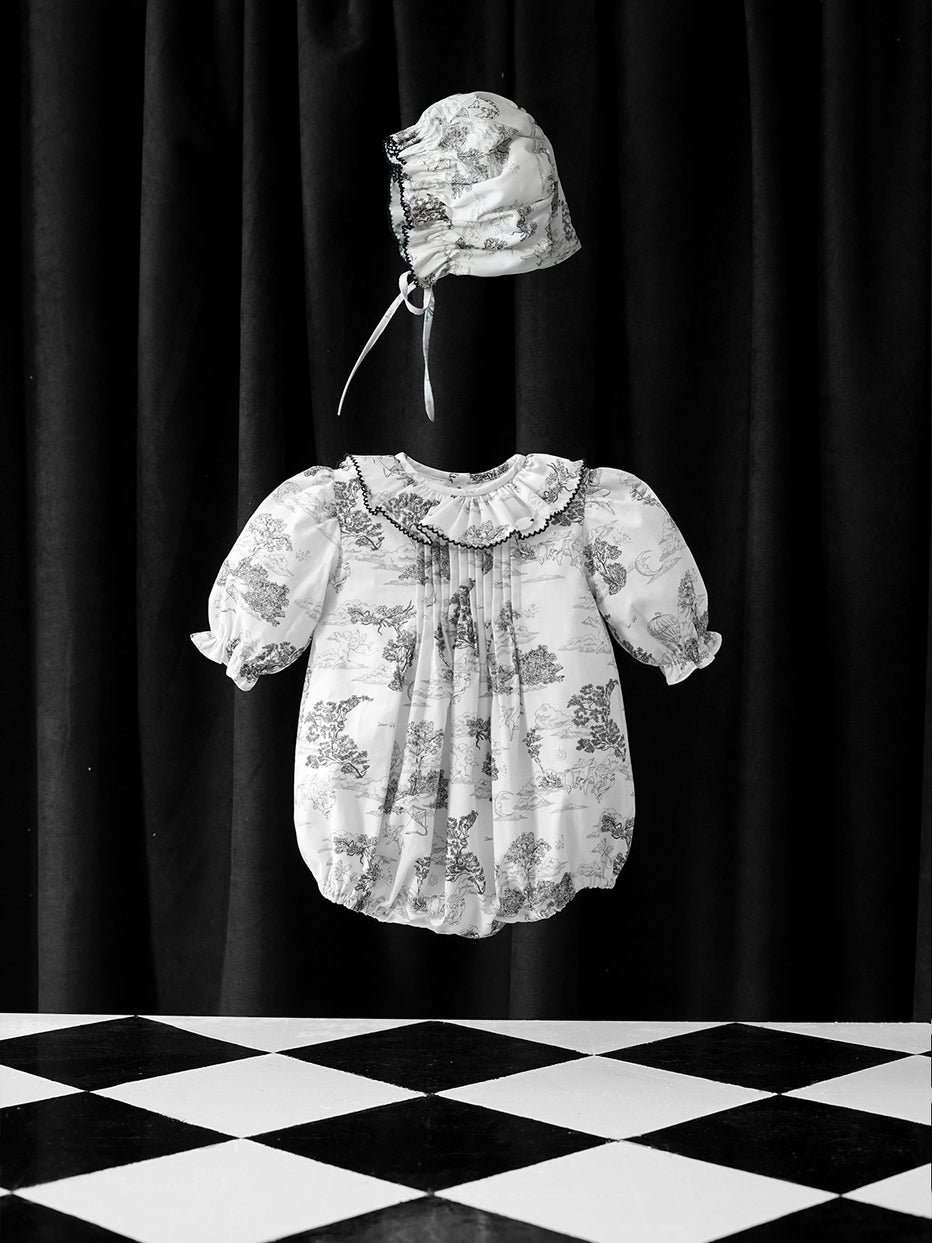 The Margot Romper set is the absolute darling outfit for younger baby girls, featuring a whimsical toile de jouy pattern, exclusively made for Dear GG. This two piece set features matching bonnet with long sleeved romper with ruffled collar. The set comes in two classic color: French Blue and Midnight Black.