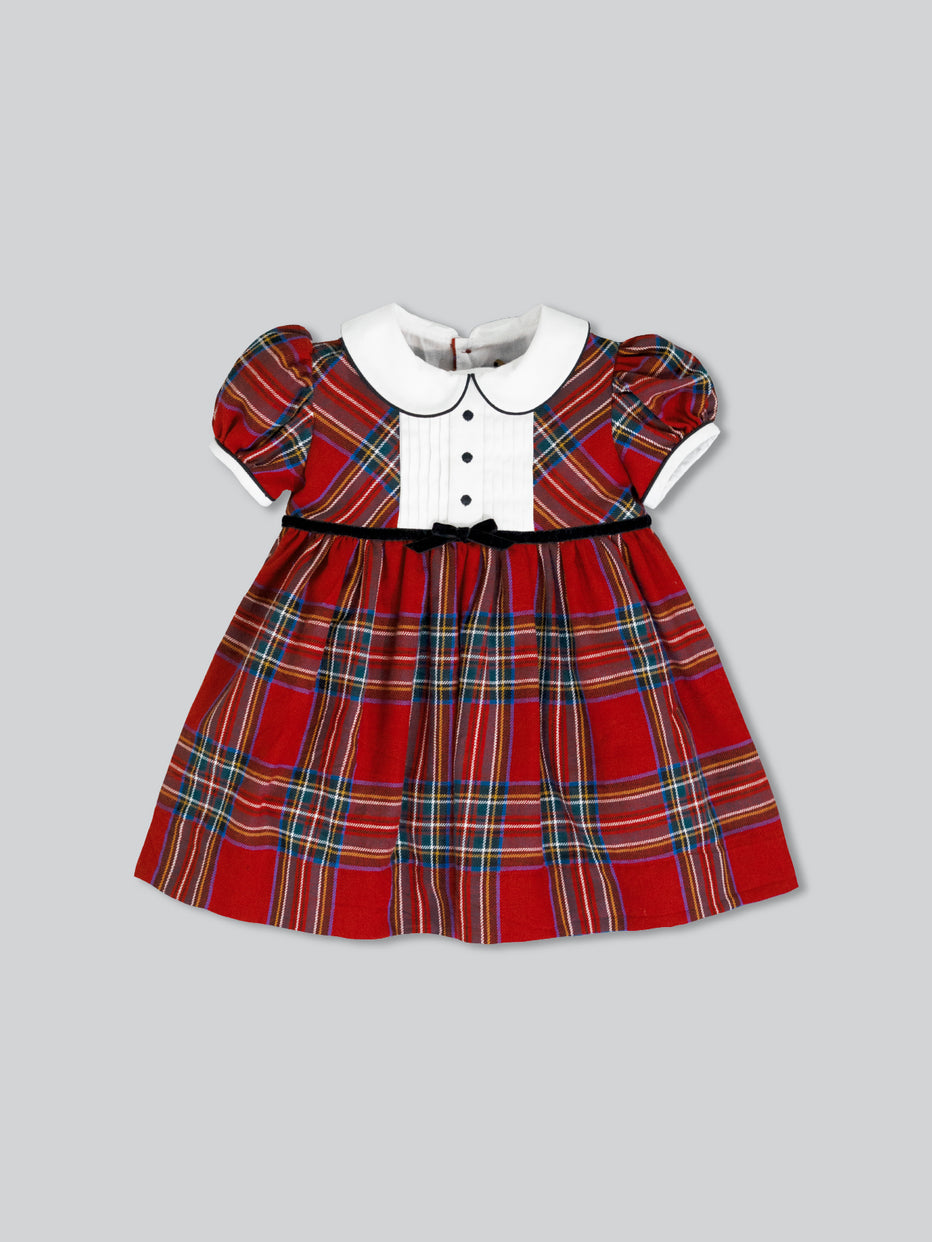 Our Nicole Dress is making a comeback this season with a dazzling scarlet tartan fabric. This best-selling dress features velvet bow detail, along with pleated fabrics and embroidered faux buttons on the chest. A festive addition to this holiday season!