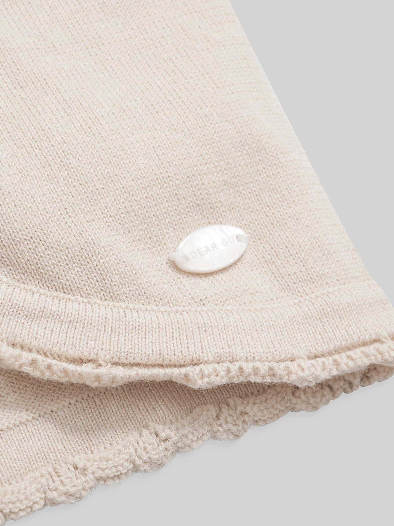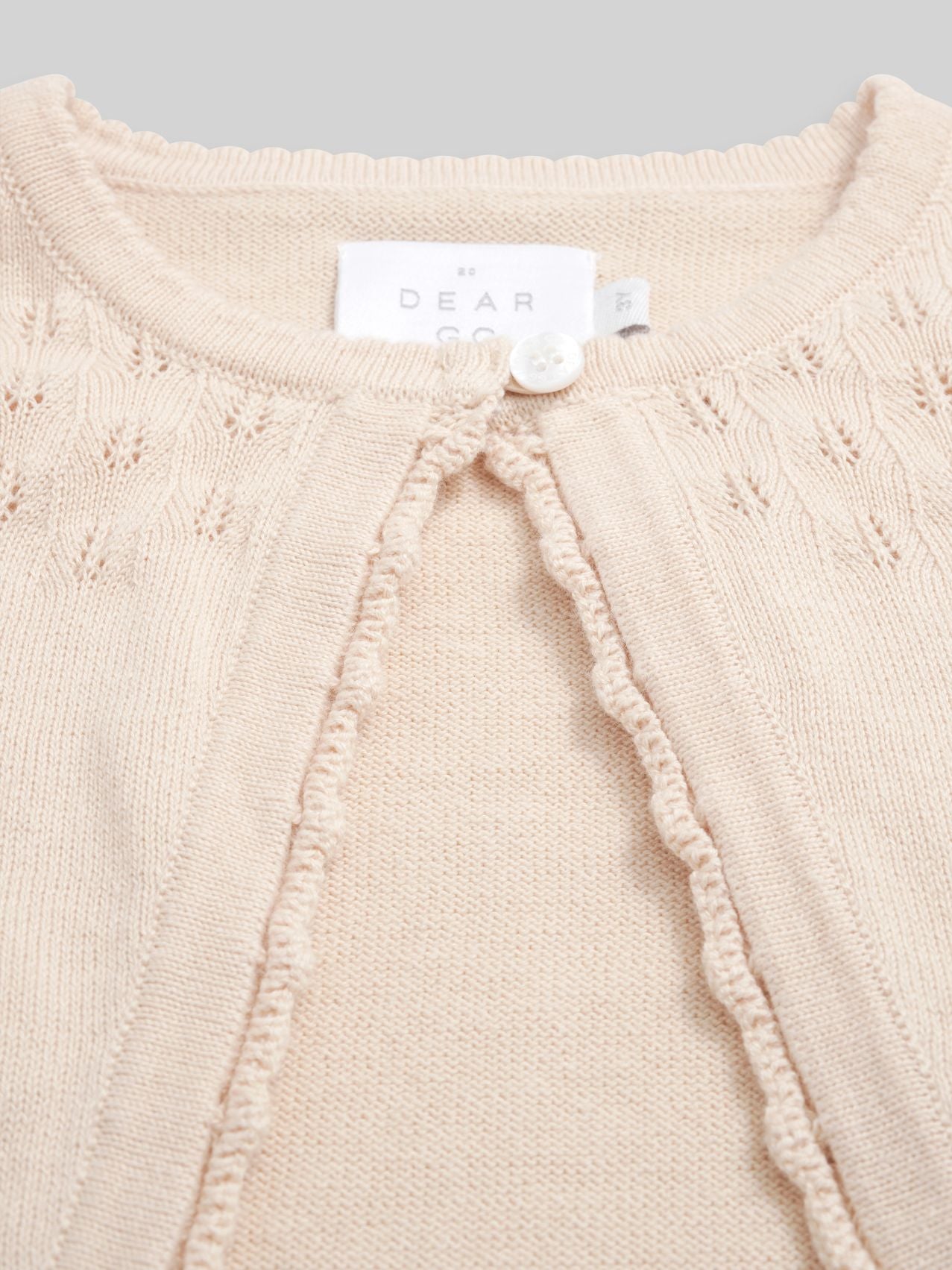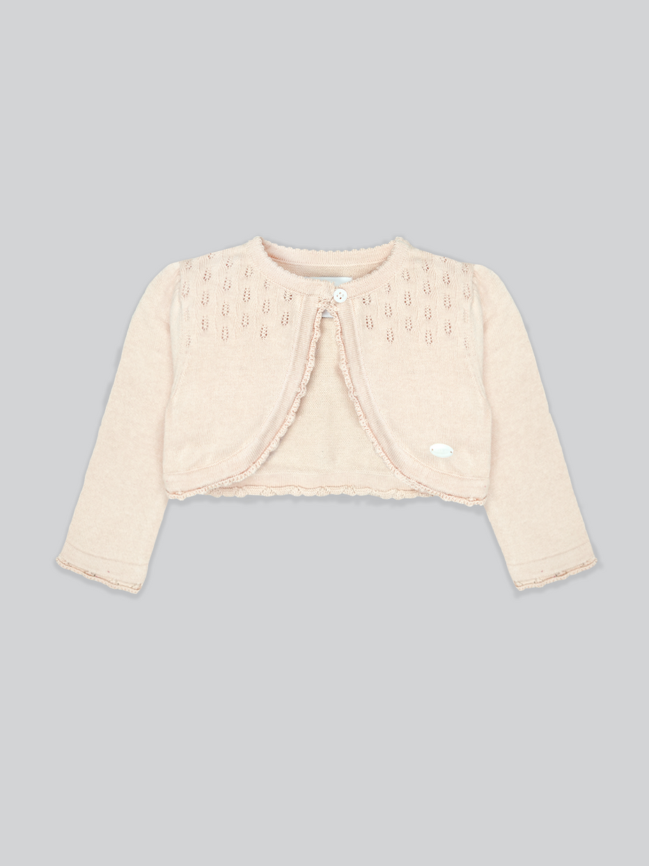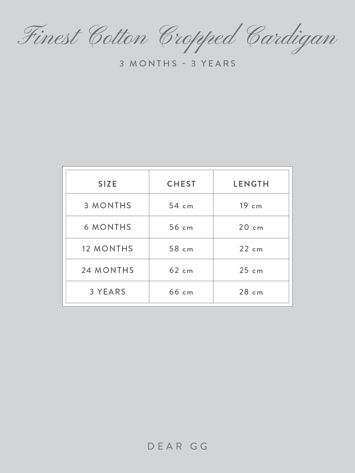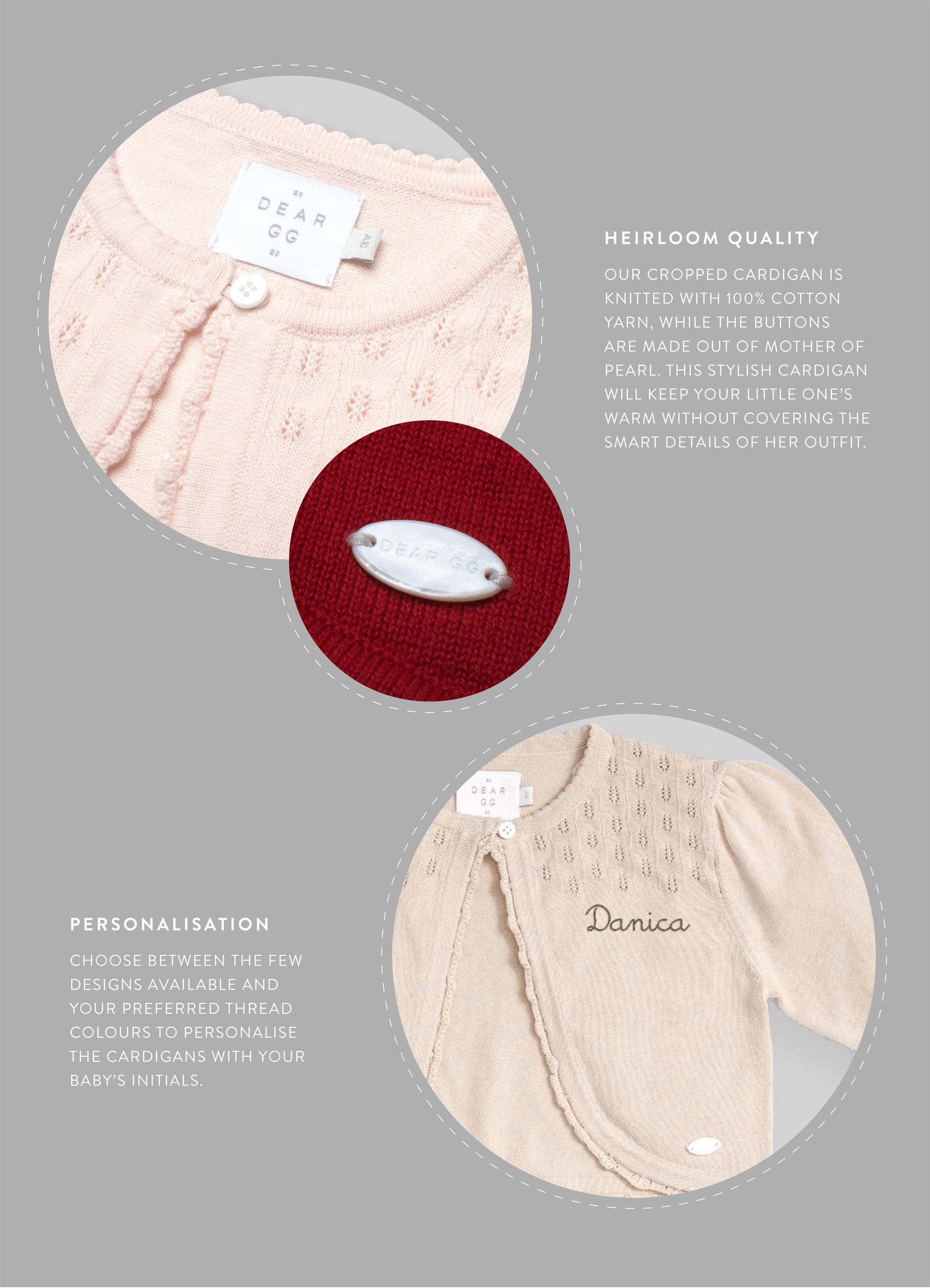 The finest cotton cropped cardigan by Dear GG. Fastened with a single button at the top of the neck part, and kitted with soft and light-weight cotton yarn, that is ideal for the baby's skin. It will complement your little girl's look and to keep her warm without covering the smart details of her outfit.
