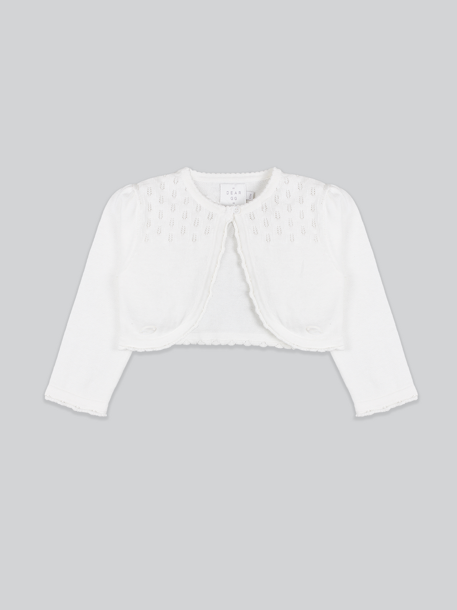 The finest cotton cropped cardigan by Dear GG. Fastened with a single button at the top of the neck part, and kitted with soft and light-weight cotton yarn, that is ideal for the baby's skin. It will complement your little girl's look and to keep her warm without covering the smart details of her outfit.