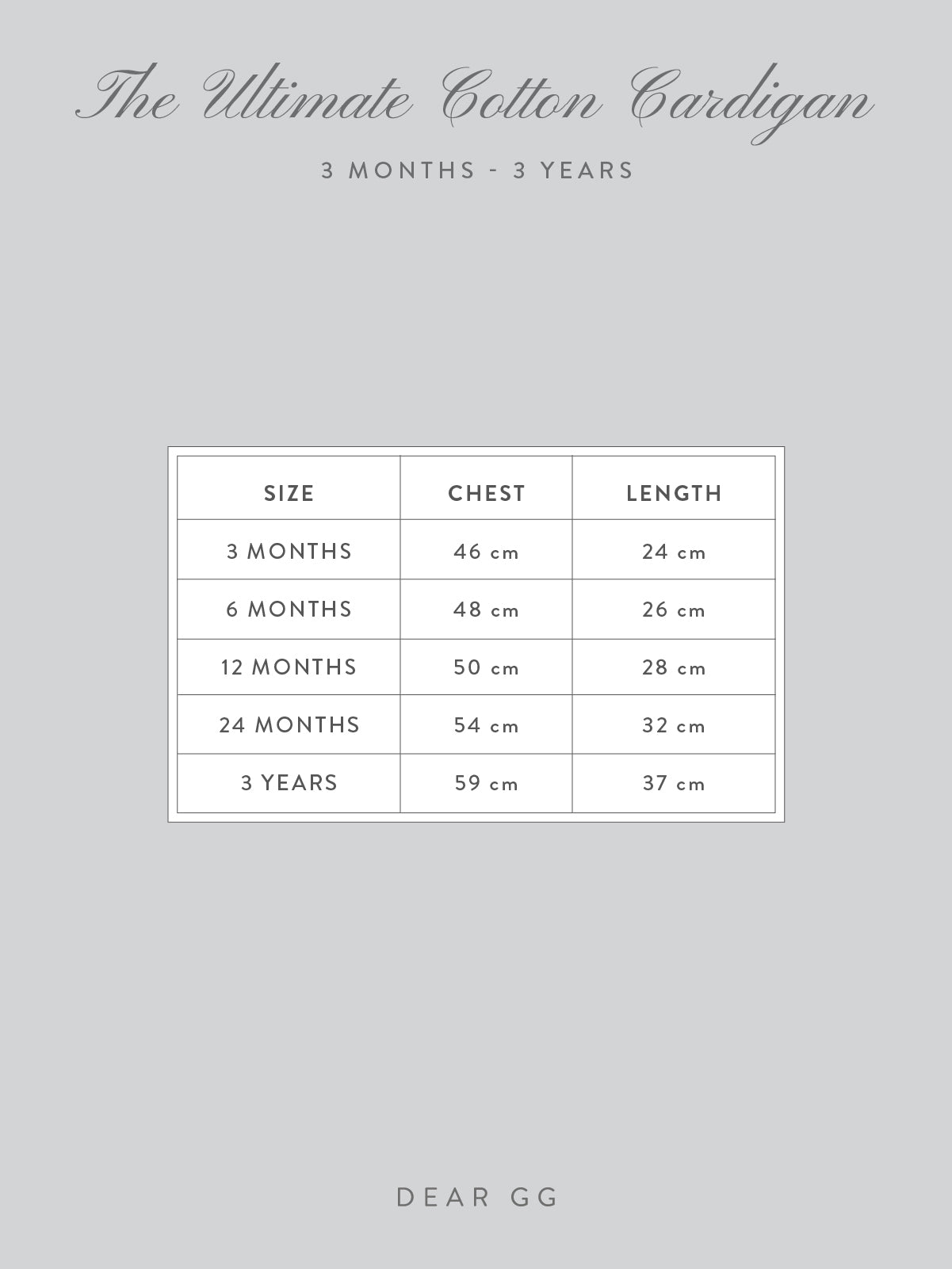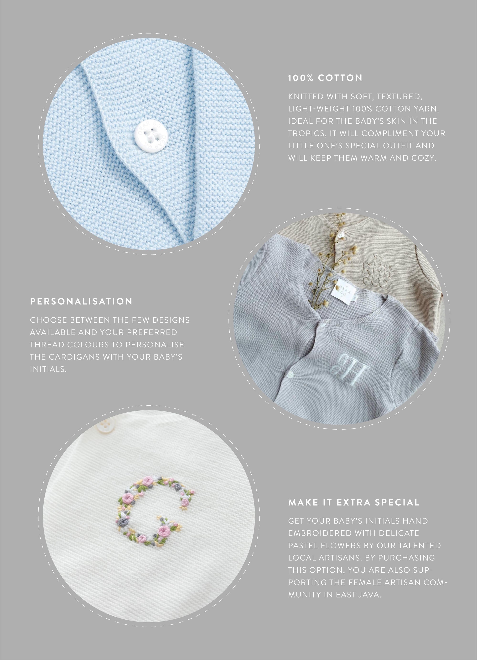 The Ultimate Cotton Cardigan by Dear GG. Made from soft, textured, light-weight knitted 100% cotton yarn. Ideal for the baby's skin, it will compliment your little one's special outfit and will keep them warm and cozy.